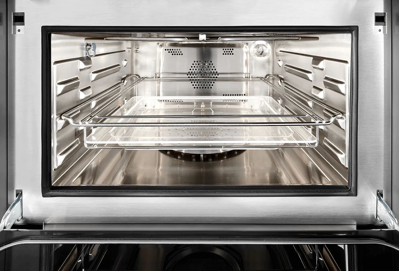 Многофункциональный компактный электрический духовой шкаф с функциями пароварки и микроволновой печи.
