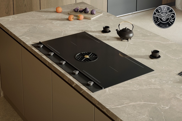 Сочетание матового покрытия Carbonio с глянцевой черной стеклянной поверхностью создает изысканный баланс между визуальной легкостью и профессиональной основательностью. Ручки из титана обеспечивают надежный хват и точный контроль, а в центре панели выделяется решетка вытяжки. Четыре зоны мощностью 3 кВт каждая гарантируют решение абсолютно любой кулинарной задачи, а система вытяжки мощностью 610 м³/ч, работая быстро и тихо.